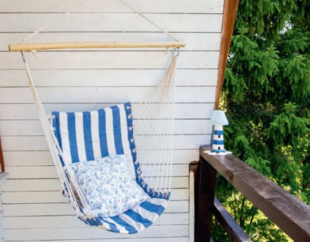 I jedno, i drugie to rozwiązania łączące w sobie walory huśtawki oraz hamaka, doskonałe dla tych, którzy dysponują niewielkim ogrodem albo nie posiadają go w ogóle (mając jedynie balkon lub loggię). Hamaki brazylijskie to wiszące siedziska o analogicznej konstrukcji do tradycyjnego hamaka, z tym że ich boki zostały zebrane i rozpięte na jednym drążku nośnym, co nadało im formę siedziska. Wyściełane miękkimi poduszkami stanowią fantastyczny mebel do bujania. Takie niewielkie, pojedyncze hamaki w formie sznurkowego podwieszanego fotela można bez problemu zamontować nawet na niewielkim balkonie – wystarczy jedynie silne mocowanie, np. do płyty balkonu sąsiada z góry. Podobne zastosowanie mają plecione huśtawki określane mianem bocianiego gniazda – zadowolą one zarówno posiadaczy pięknych obszernych ogrodów, jak i właścicieli niewielkich przestrzeni zielonych. Bocianie gniazdo doskonale sprawdzi się w roli pełnofunkcjonalnej bujawki wśród wysokich drzew, z powodzeniem odnajdzie się również w kąciku tarasowym, na balkonie czy loggii, zapewniając wypoczynek w lekkim kołysaniu nad ziemią. Walorem tego typu mebla podwieszanego jest bardzo lekka ażurowa forma. Konstrukcja bocianiego gniazda jest bowiem zwykle ręcznie pleciona w technice makramy wokół stelaża na planie koła (stąd nazwa), co sprawia, że doskonale wpisuje się w letnie zakątki w stylu boho. O ile tradycyjne hamaki sprzyjają zażywaniu spokojnego snu, o tyle podwieszane fotele są doskonałym miejscem do czytania czy przeglądania stron internetowych na tablecie lub telefonie.